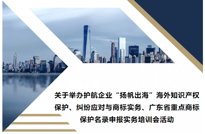 • 關(guān)于舉辦護(hù)航企業(yè)“揚(yáng)帆出海”海外知識(shí)產(chǎn)權(quán)保護(hù)、糾紛應(yīng)對(duì)與商標(biāo)實(shí)務(wù)、廣東省重點(diǎn)商標(biāo)保護(hù)名錄申報(bào)實(shí)務(wù)培訓(xùn)會(huì)活動(dòng)